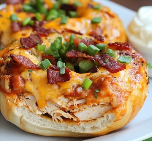 - Add Toppings: Spoon a generous amount of the chicken and bacon mixture evenly over each bagel half, spreading it right to the edges. Drizzle the remaining ¼ cup of enchilada sauce over the top of the filled bagels. Finally, sprinkle the remaining shredded cheeses and the rest of the chopped green onions over each bagel half.