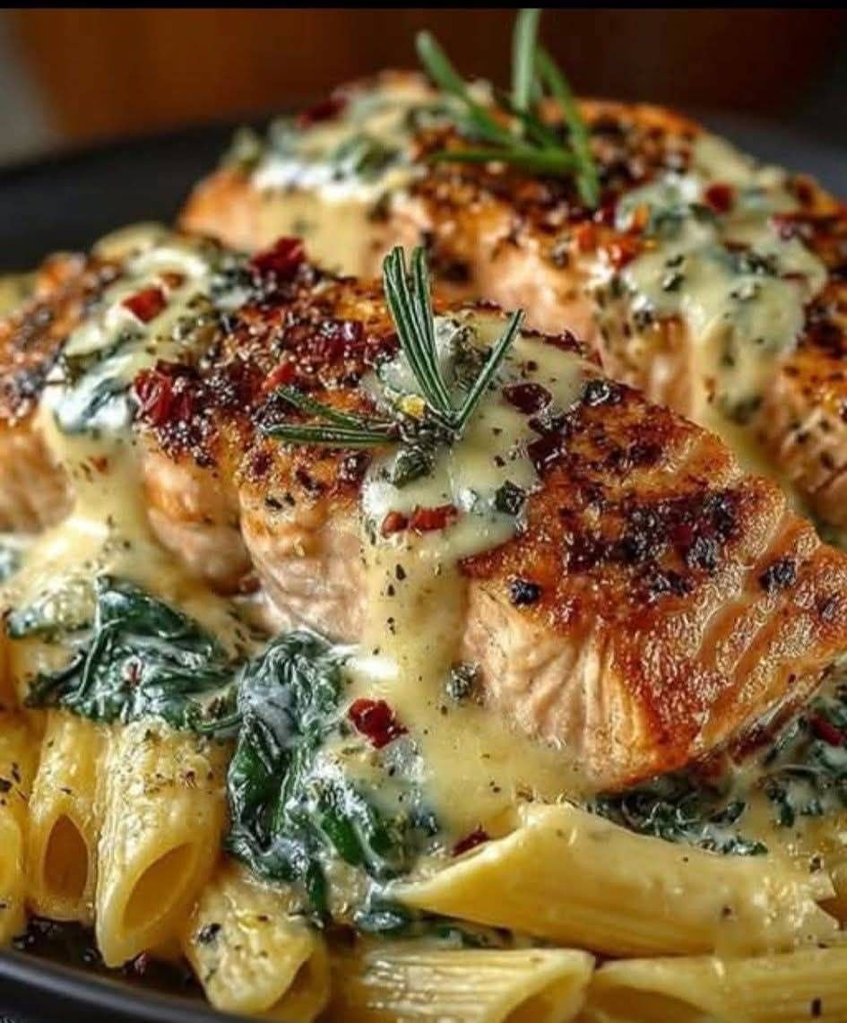 Tuscan Salmon with Creamy Garlic Alfredo Penne: An Italian Feast!