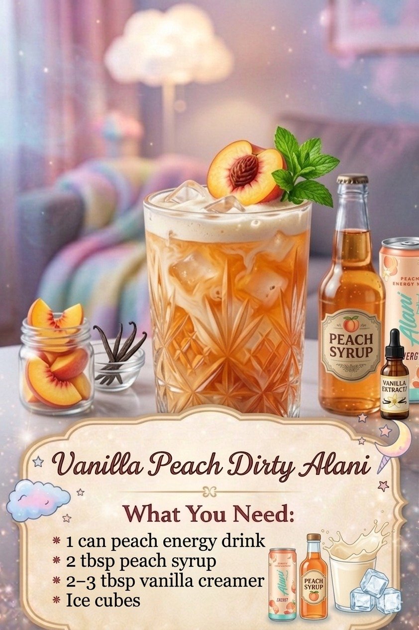 If you love fun drink recipes that feel a little indulgent but still come together in minutes, this Vanilla Peach Dirty Alani is about to become a favorite. It is sweet, creamy, peachy, and packed with that bold energy drink kick that makes it perfect for afternoons when you need a little boost. The combination of peach syrup, peach energy drink, and vanilla creamer creates a smooth, soda-shop-style drink with a pretty swirl on top and a flavor that feels far more special than the tiny effort it takes to make.