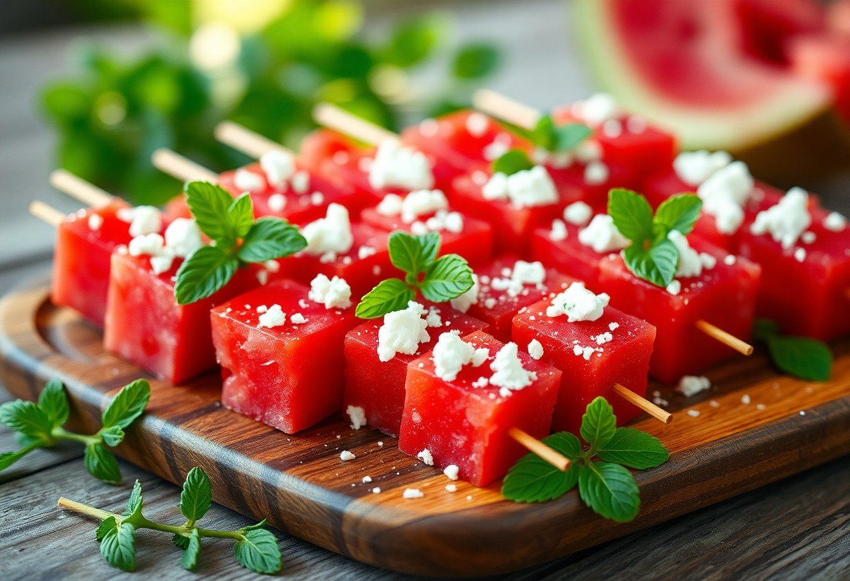 - Repeat until each skewer is filled, alternating between watermelon and feta.