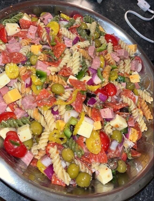 This salad is all about big flavor, bold texture, and easy prep. The tri-color rotini grabs onto the zesty Italian dressing, and each bite is studded with savory meats, cheeses, and bright veggies. You can customize it endlessly based on what’s in your fridge—and it just gets better after a night in the fridge.
