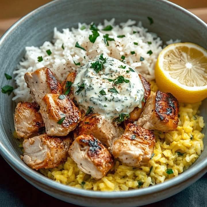 I love this recipe because it’s a perfect blend of simplicity and flavor. The chicken is marinated in a zesty blend of lemon, garlic, and herbs, which makes it incredibly tender and juicy. The rice is cooked with turmeric or saffron, which gives it a beautiful golden color and a fragrant, earthy flavor. The creamy yogurt sauce is the perfect finishing touch—it’s cool, tangy, and complements the warm chicken and rice beautifully. It’s a fantastic recipe for a weeknight because it’s so easy to throw together, but it feels special enough to serve on a weekend.